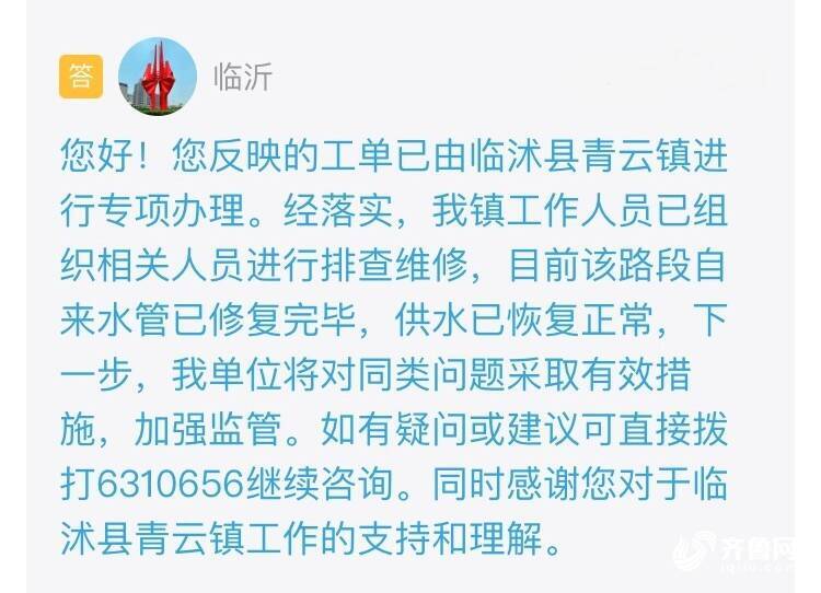 收到留言后,临沭县青云镇进行了查询处理:经执行,我镇工作人员已安排有关人员进行排查修理,现在该路段自来水管已修正结束,供水已回到正常状况,下一步,我单位将对同类问题采纳比较有用办法,加强监管。