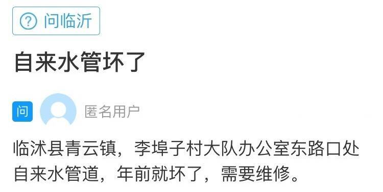 一位临沂网友在闪电新闻网络问政渠道留言说:他是临沭县青云镇李埠子村的一位乡民,村大队办公室东路口处自来水管道损坏,需求修理。